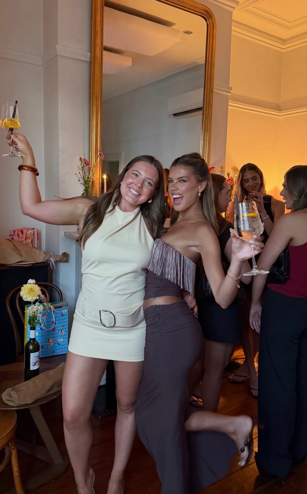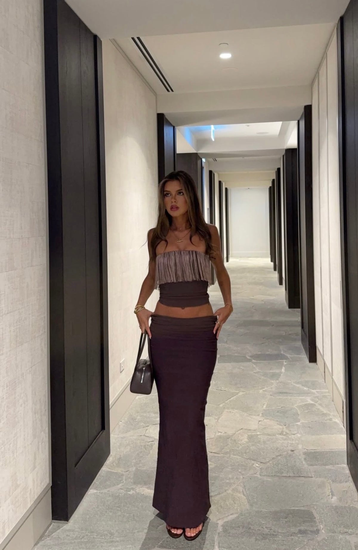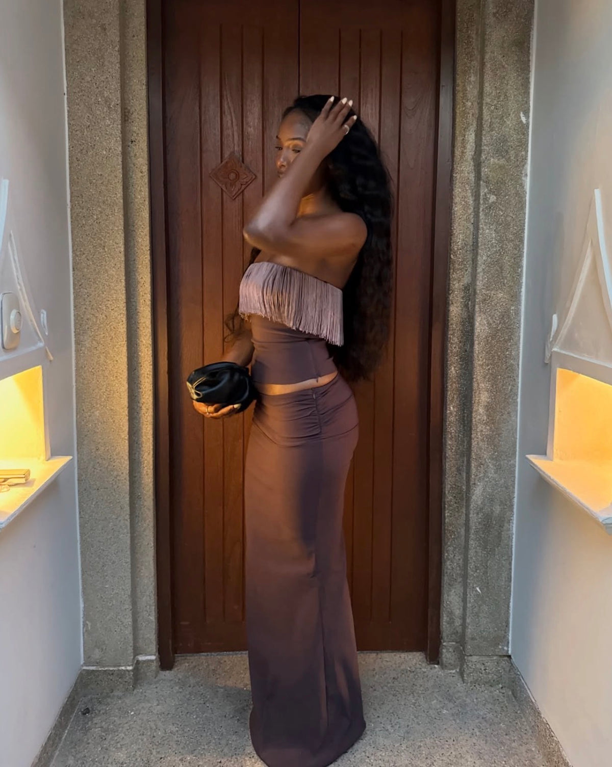 A bandeau in bengaline stretch suiting, with fringe detailing across the bust and a side zipper for a sleek, secure fit.