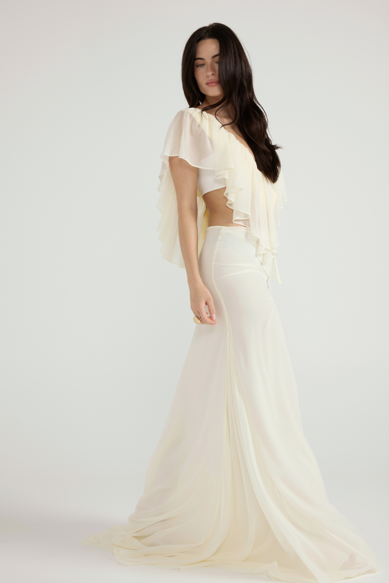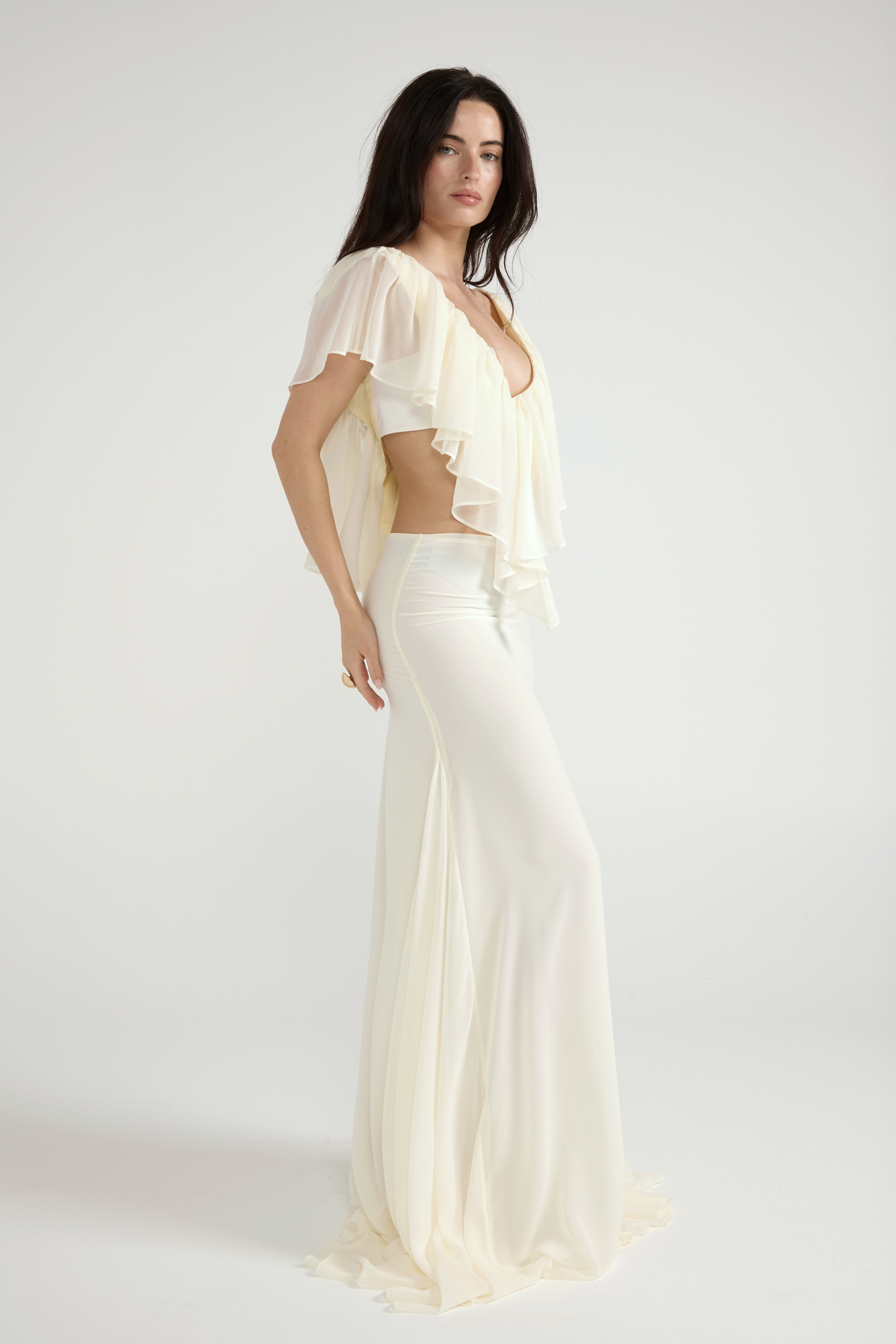 A low rise maxi skirt with a smooth, elongated fit and a soft fluted hem for natural movement. Designed in a lightweight drape that falls effortlessly over the body. Finished with an invisible side zipper for a clean, minimal look.