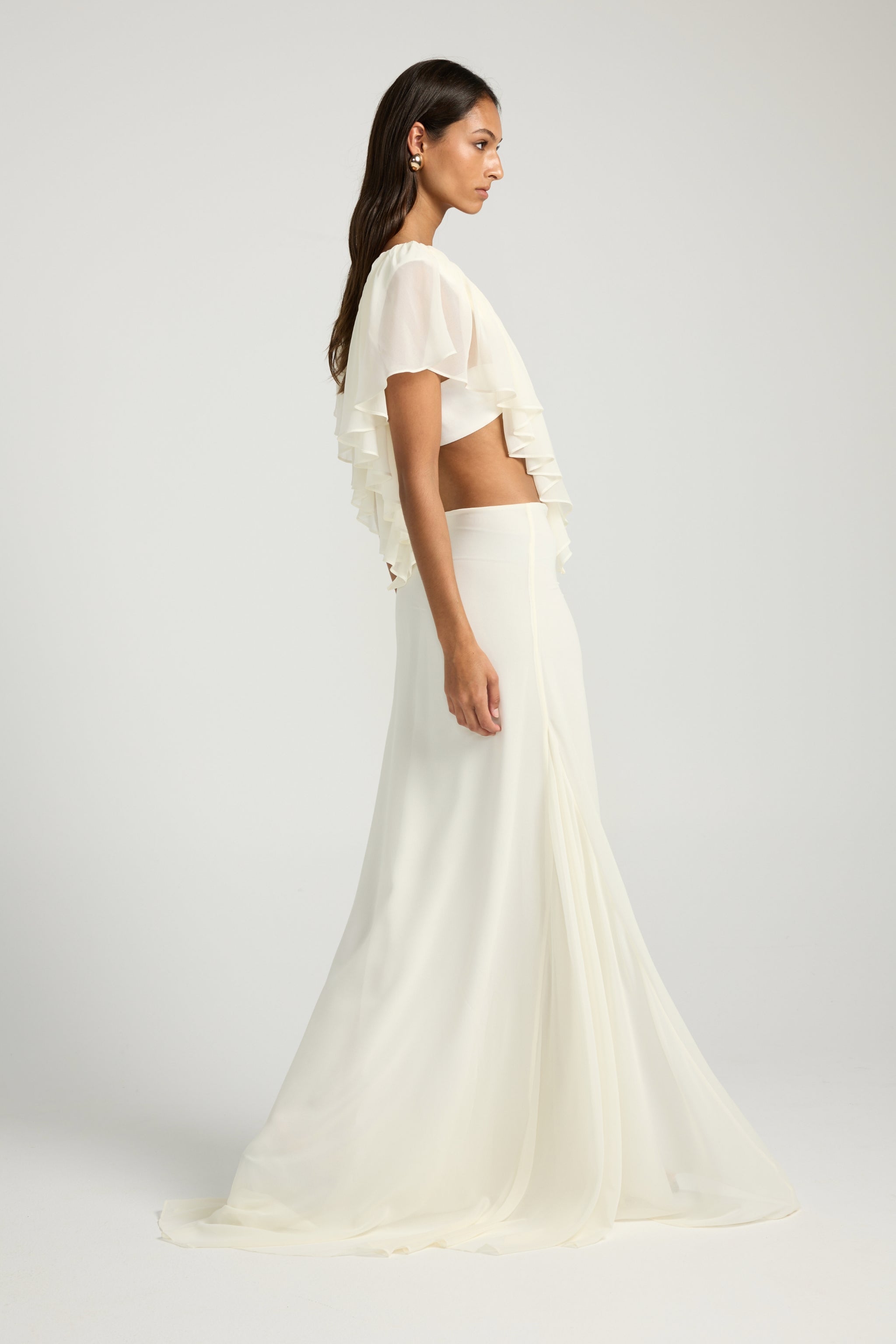 A low rise maxi skirt with a smooth, elongated fit and a soft fluted hem for natural movement. Designed in a lightweight drape that falls effortlessly over the body. Finished with an invisible side zipper for a clean, minimal look.