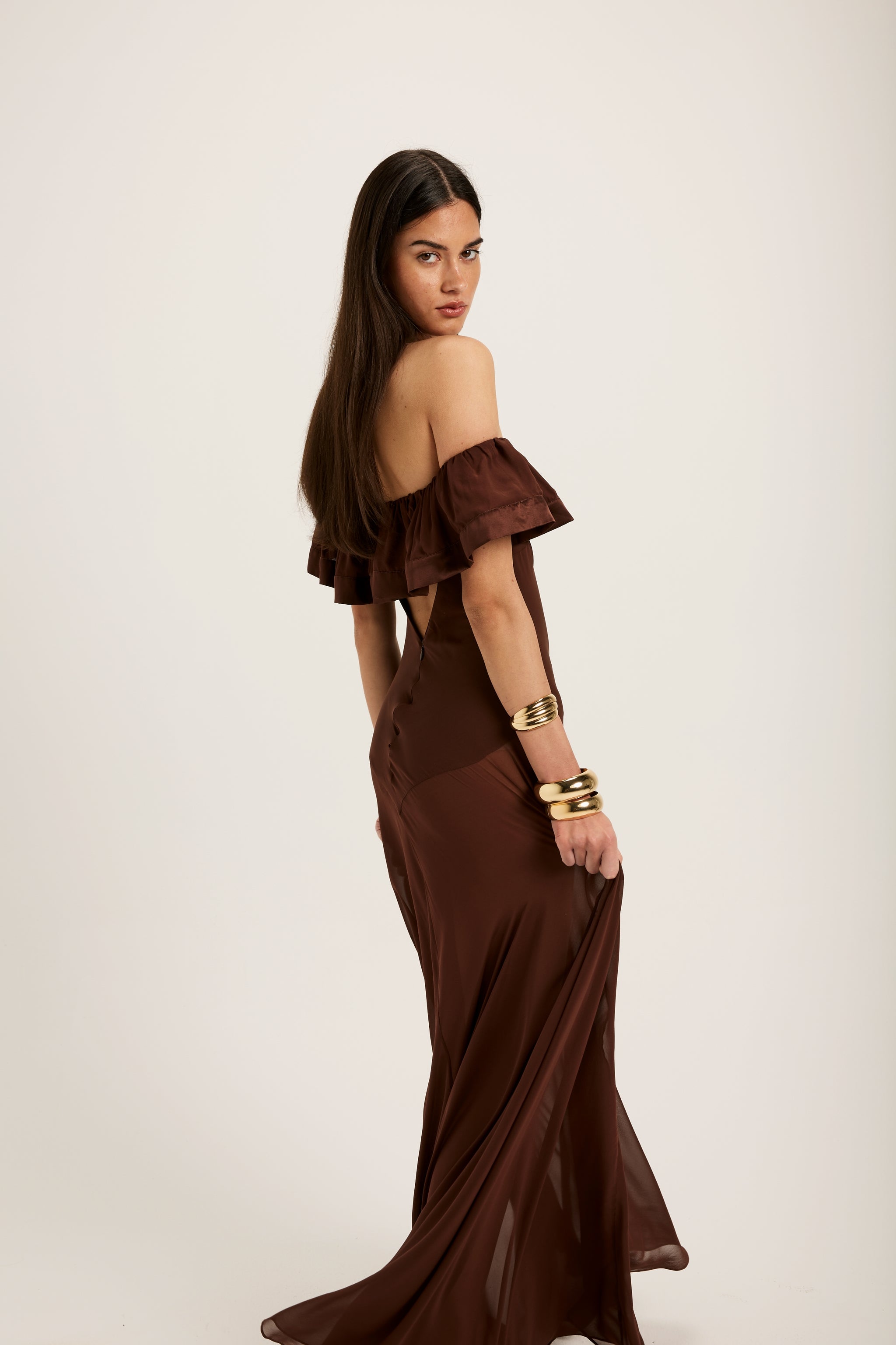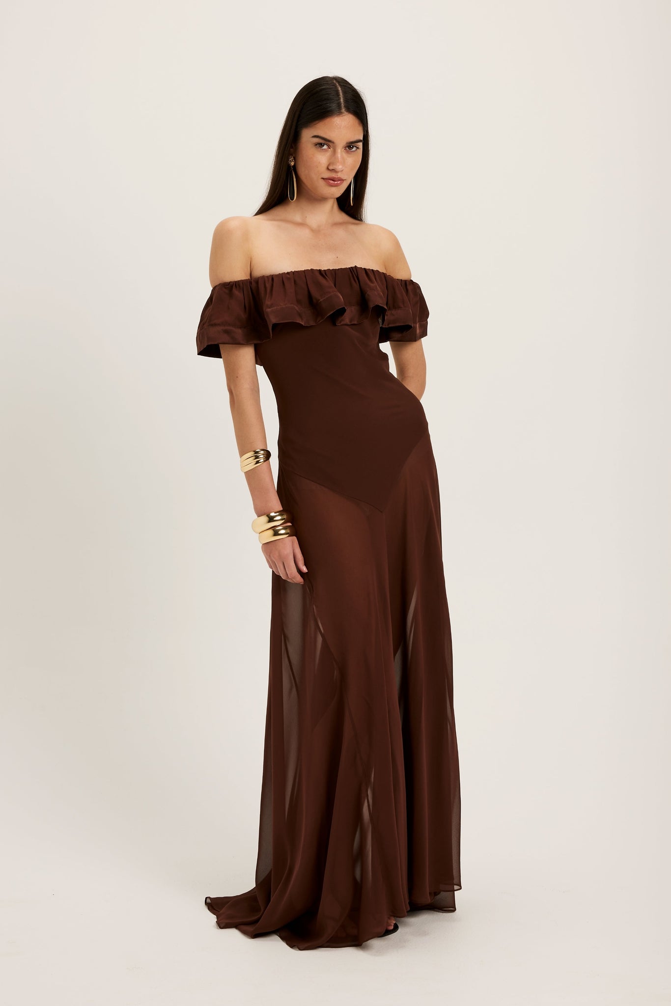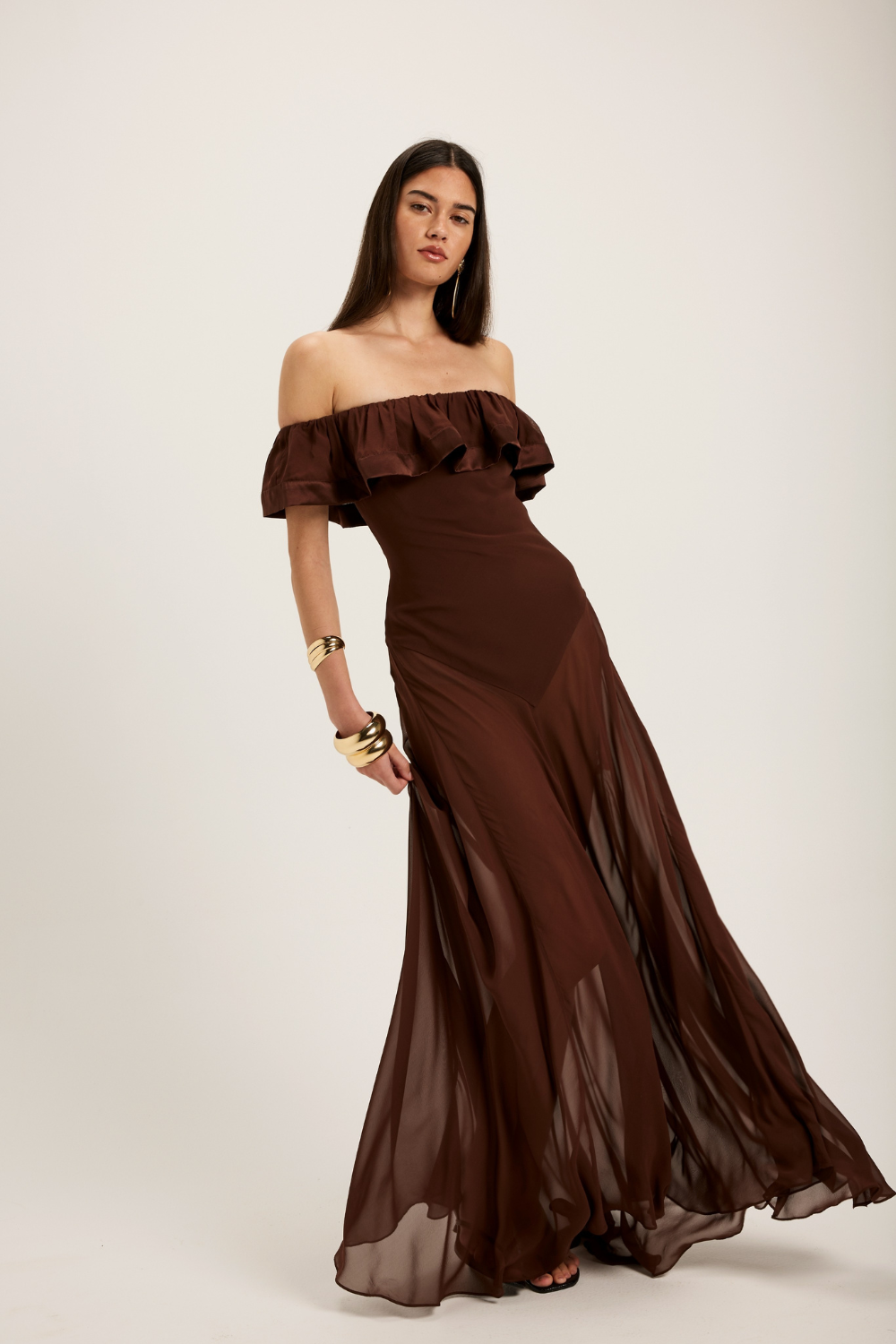 Featuring a frilled off the shoulder neckline, this 100% silk georgette chiffon drapes effortlessly over the body with fluid movement in mind. Featuring a double-lined V seam torso that creates a smooth, sculpted look. Detailed with luminous 100% silk trimming.