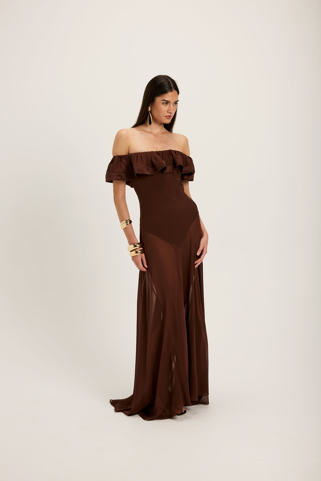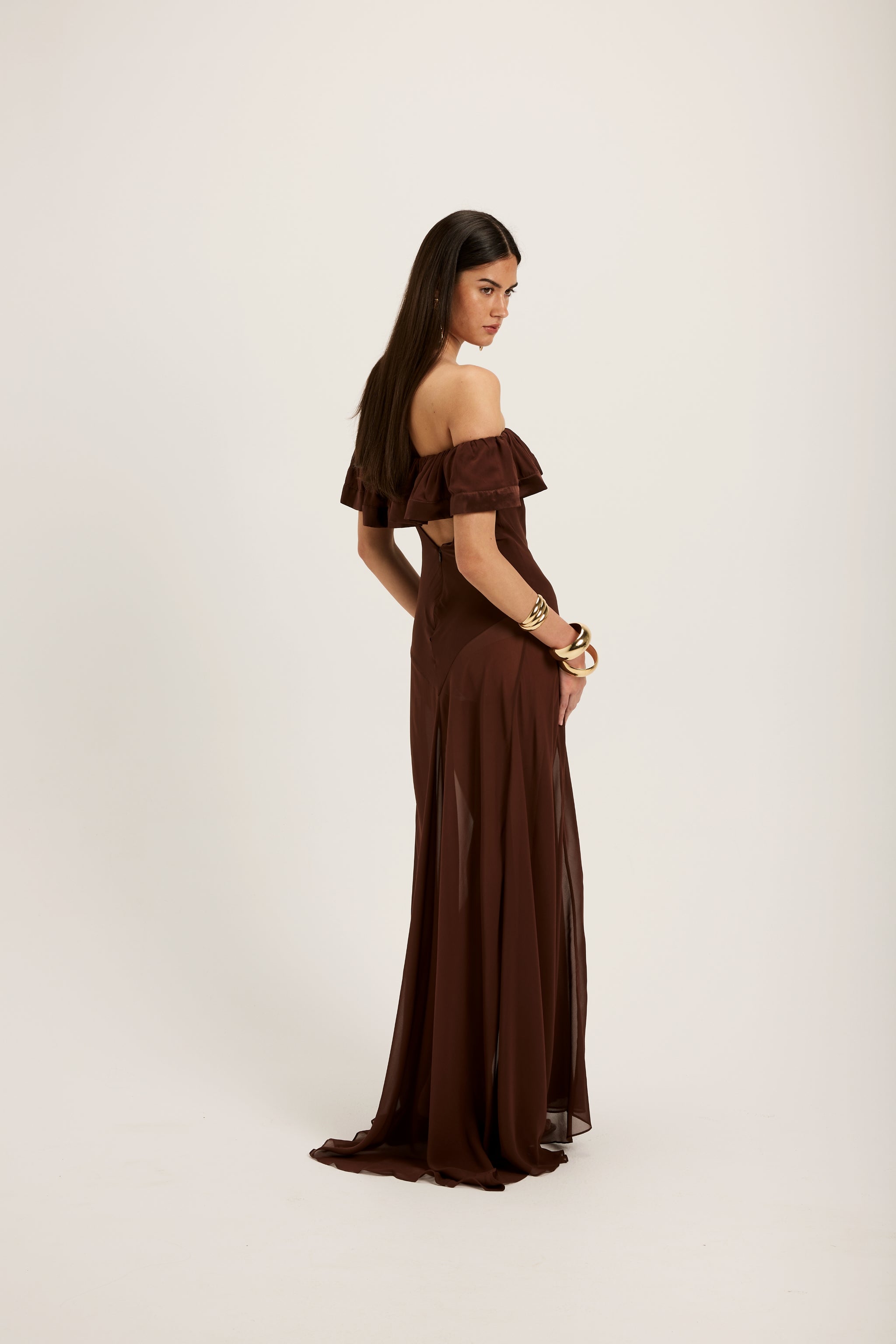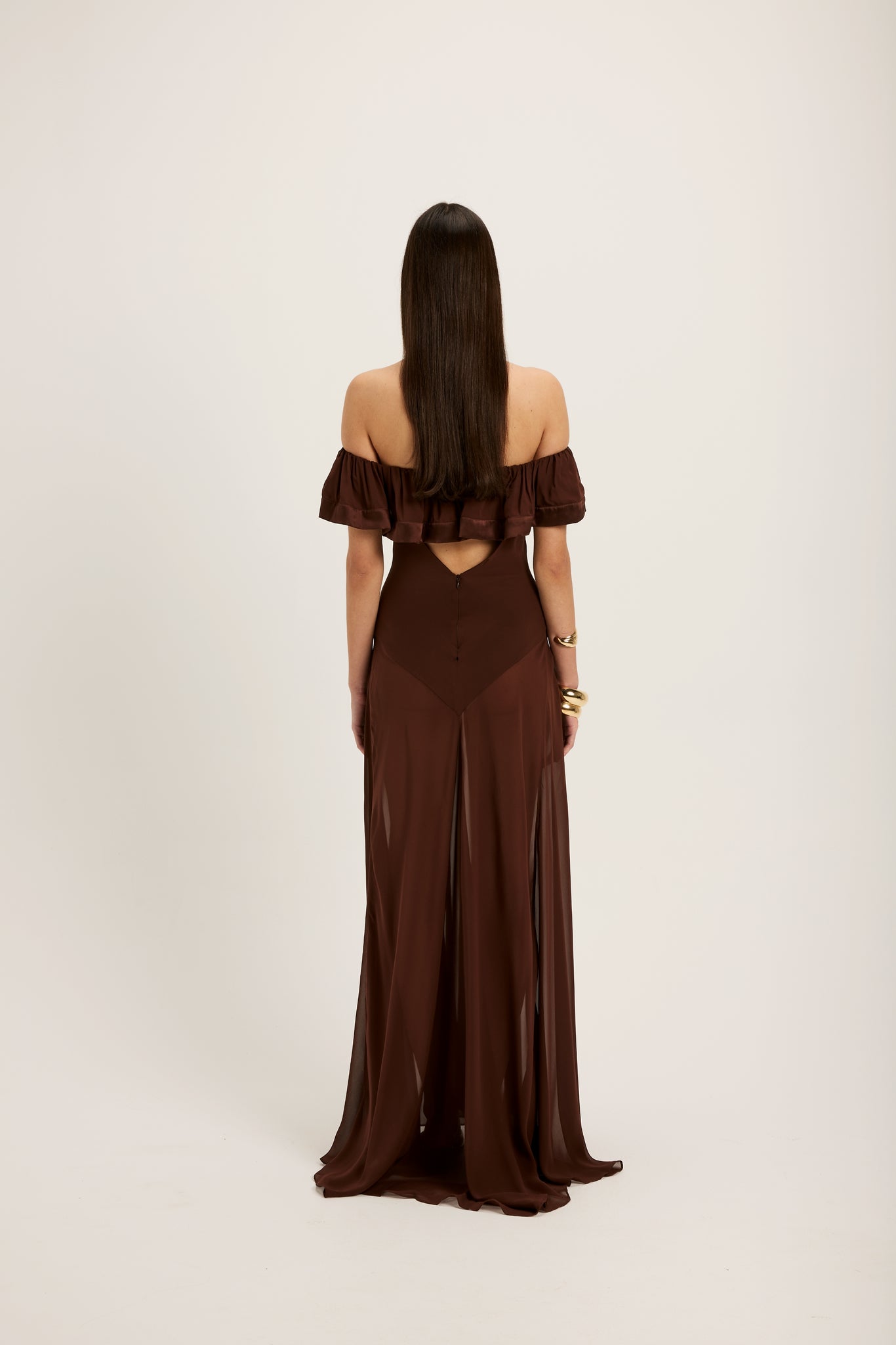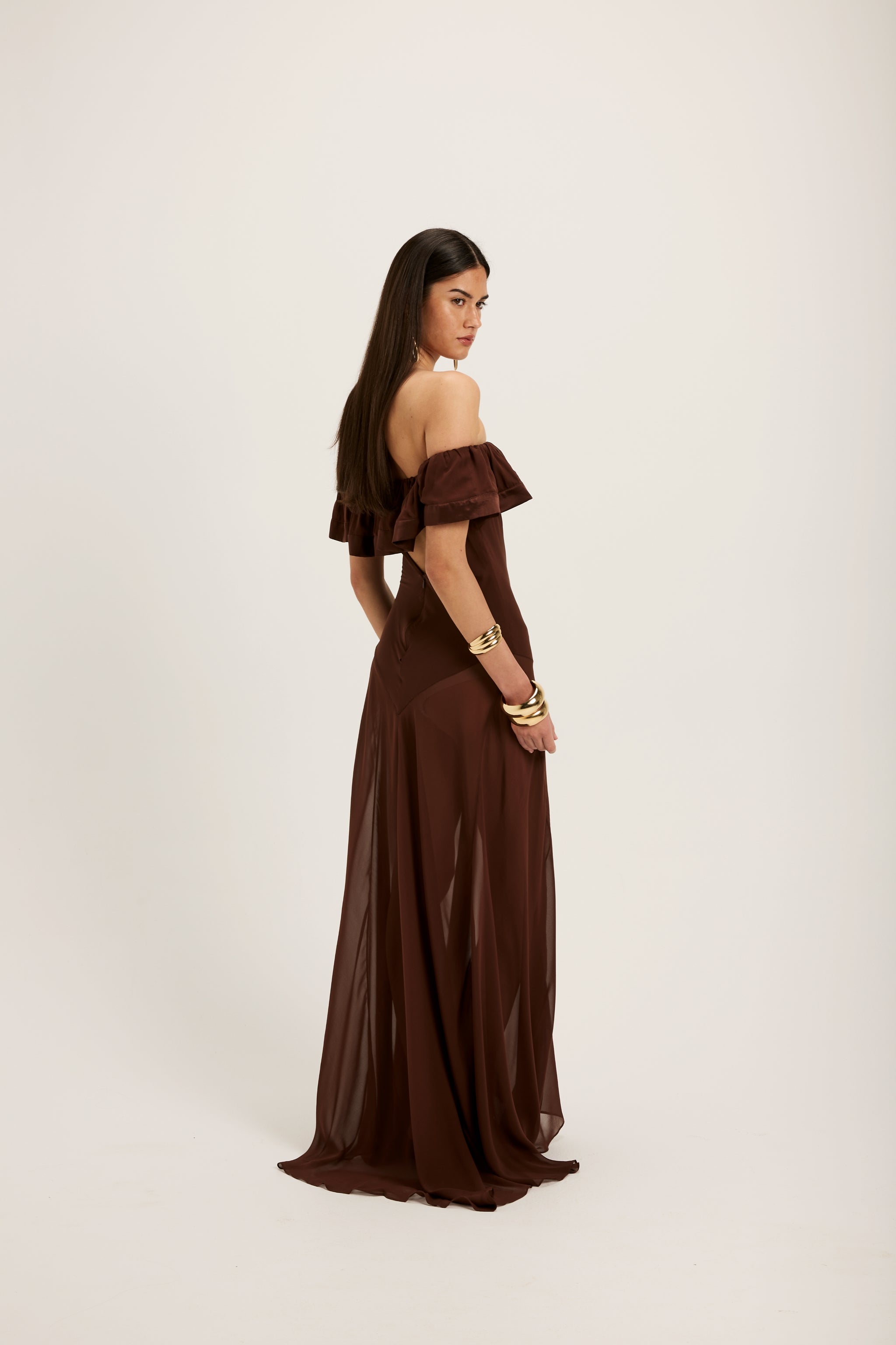 Featuring a frilled off the shoulder neckline, this 100% silk georgette chiffon drapes effortlessly over the body with fluid movement in mind. Featuring a double-lined V seam torso that creates a smooth, sculpted look. Detailed with luminous 100% silk trimming.