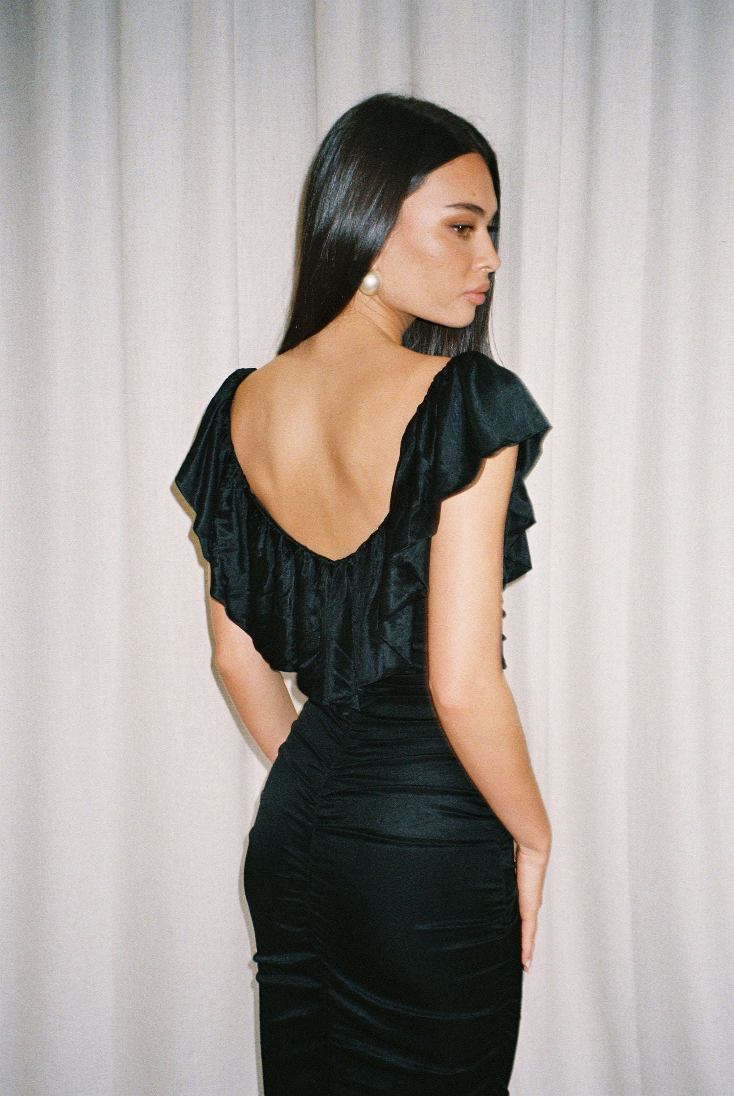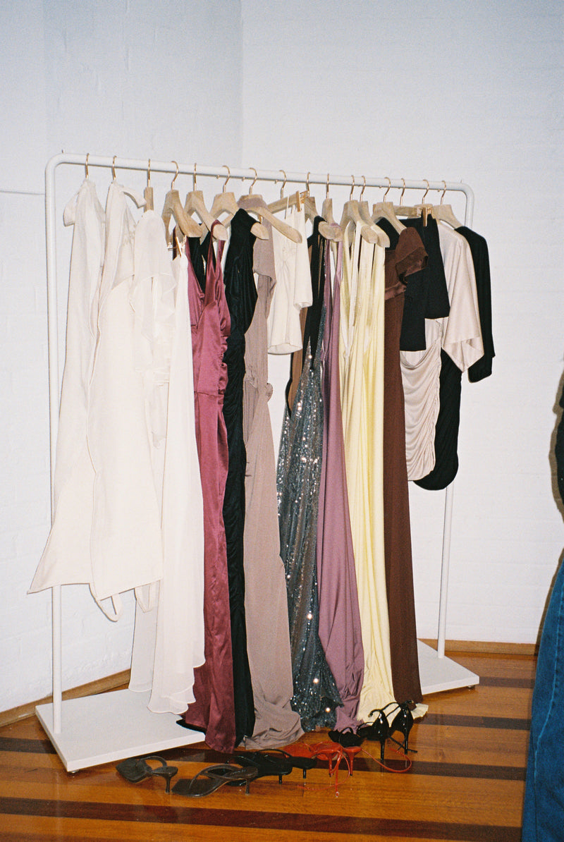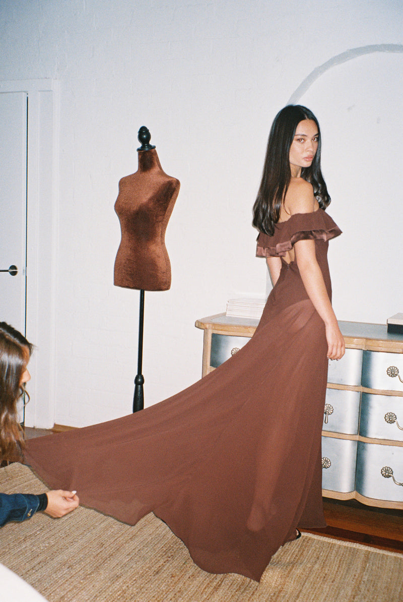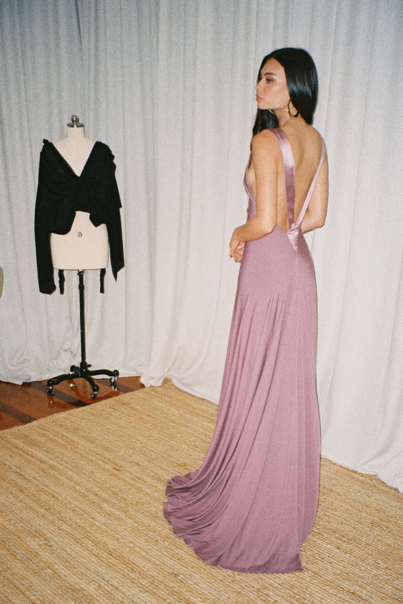 The Devon started as a classic off-the-shoulder black gown, with an overlay that drapes in soft, fluid folds. We kept the timeless neckline but refined the cut to create something flattering, confident, and effortless.