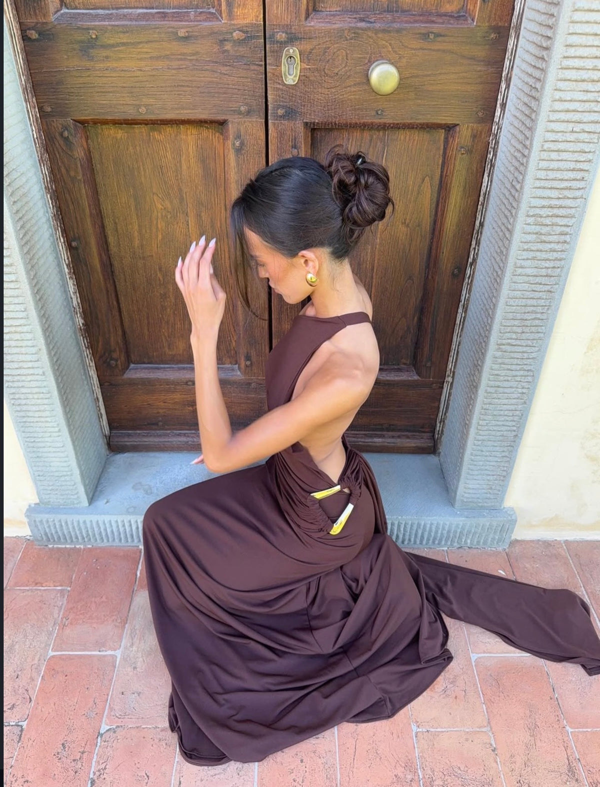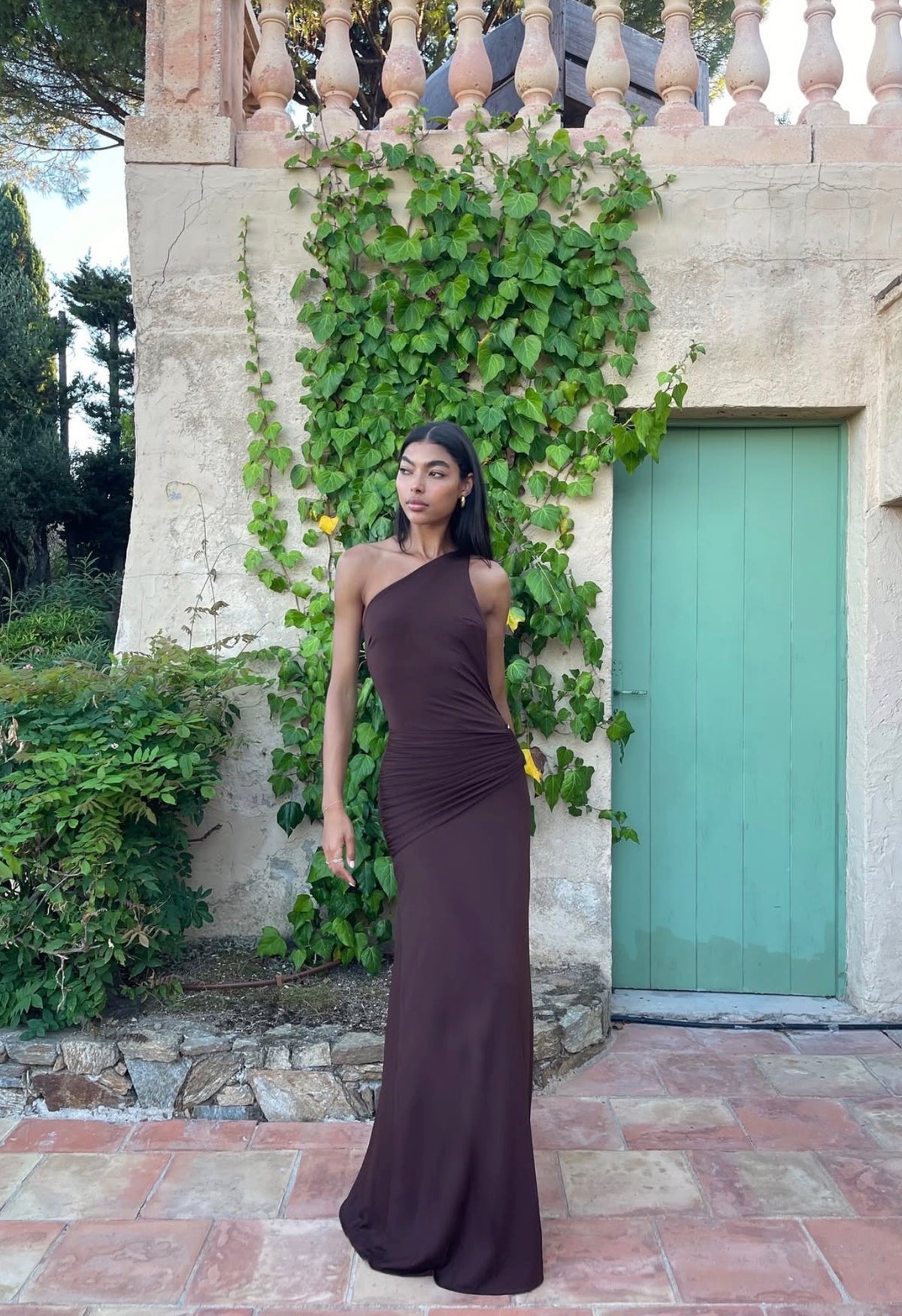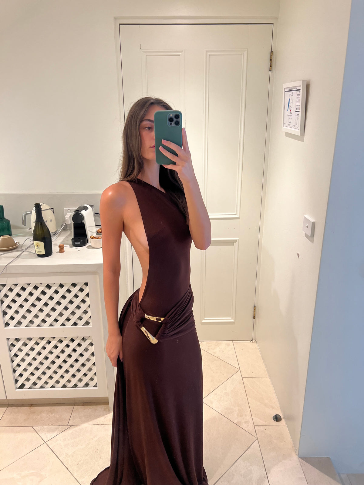 This gown features a one shoulder neckline and an open low back. Ruched draped jersey detailing hugs the waist, accentuating your silhouette. Featuring triangular gold hardware that curves around the hip.
