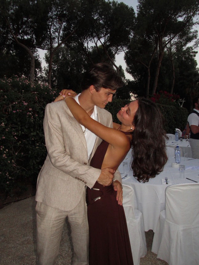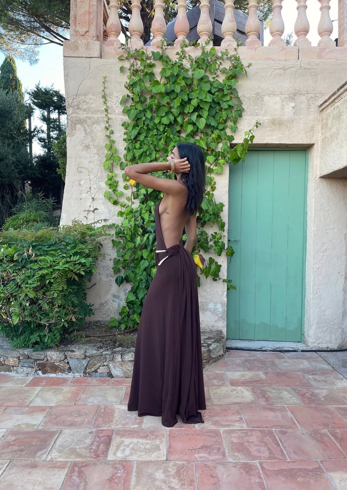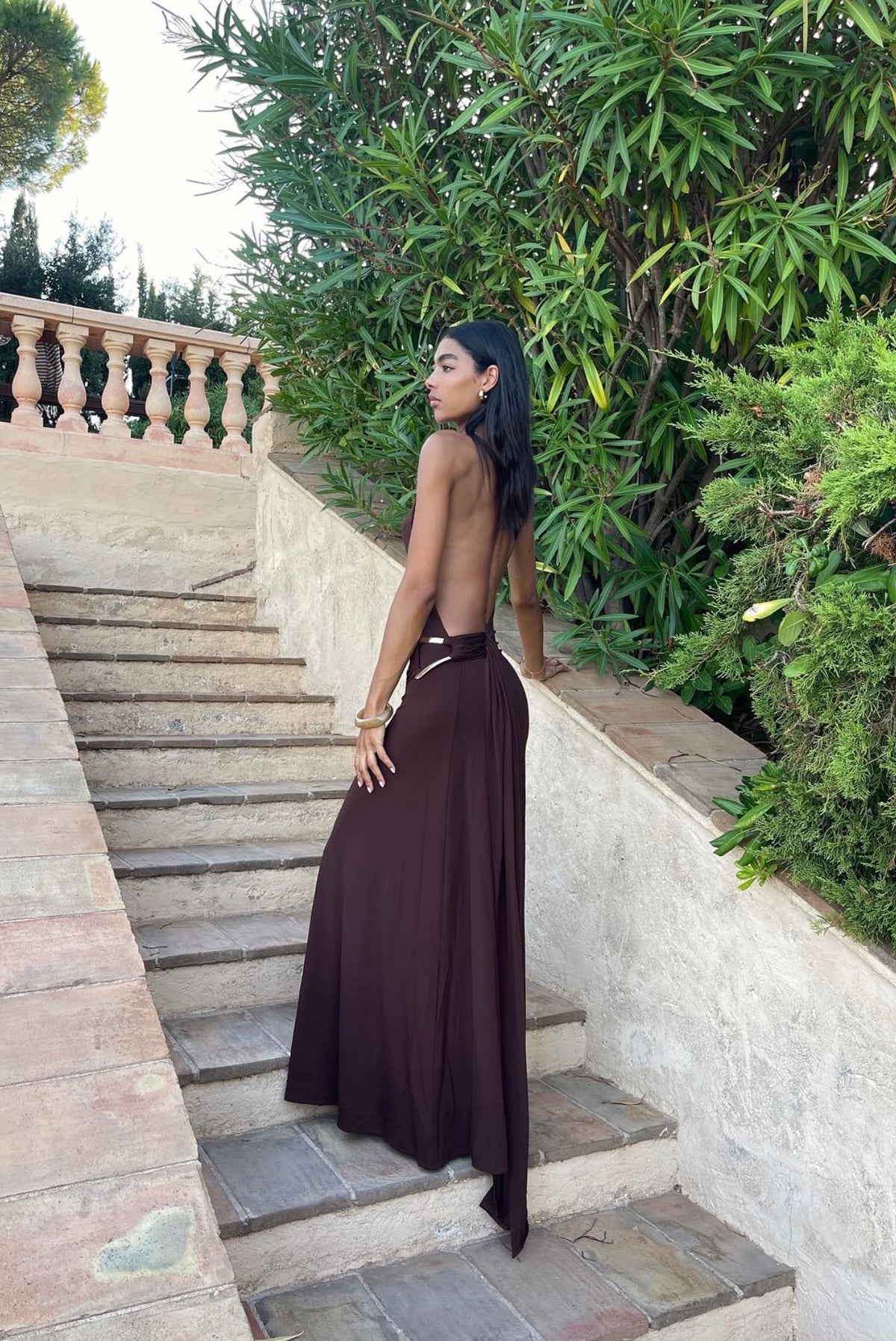 This gown features a one shoulder neckline and an open low back. Ruched draped jersey detailing hugs the waist, accentuating your silhouette. Featuring triangular gold hardware that curves around the hip.