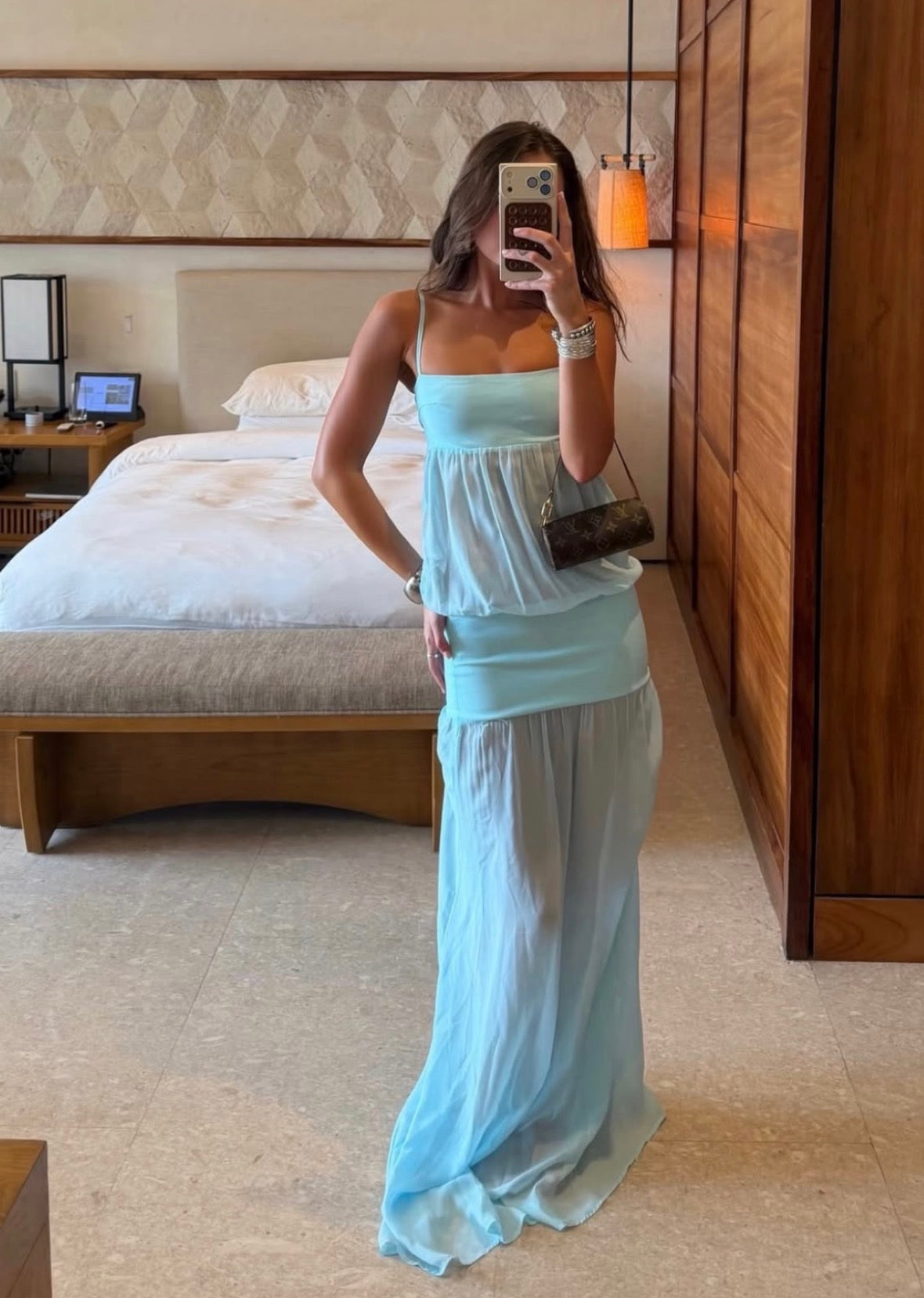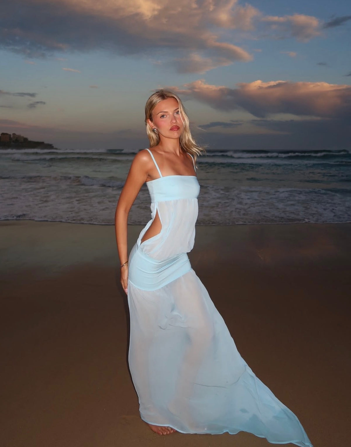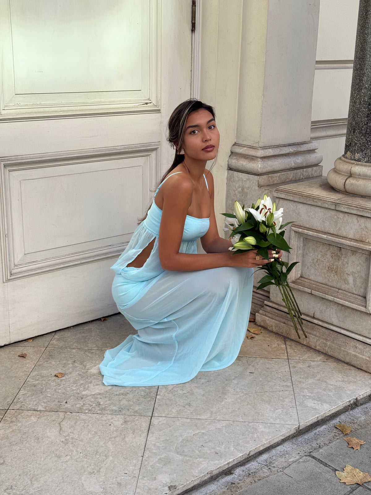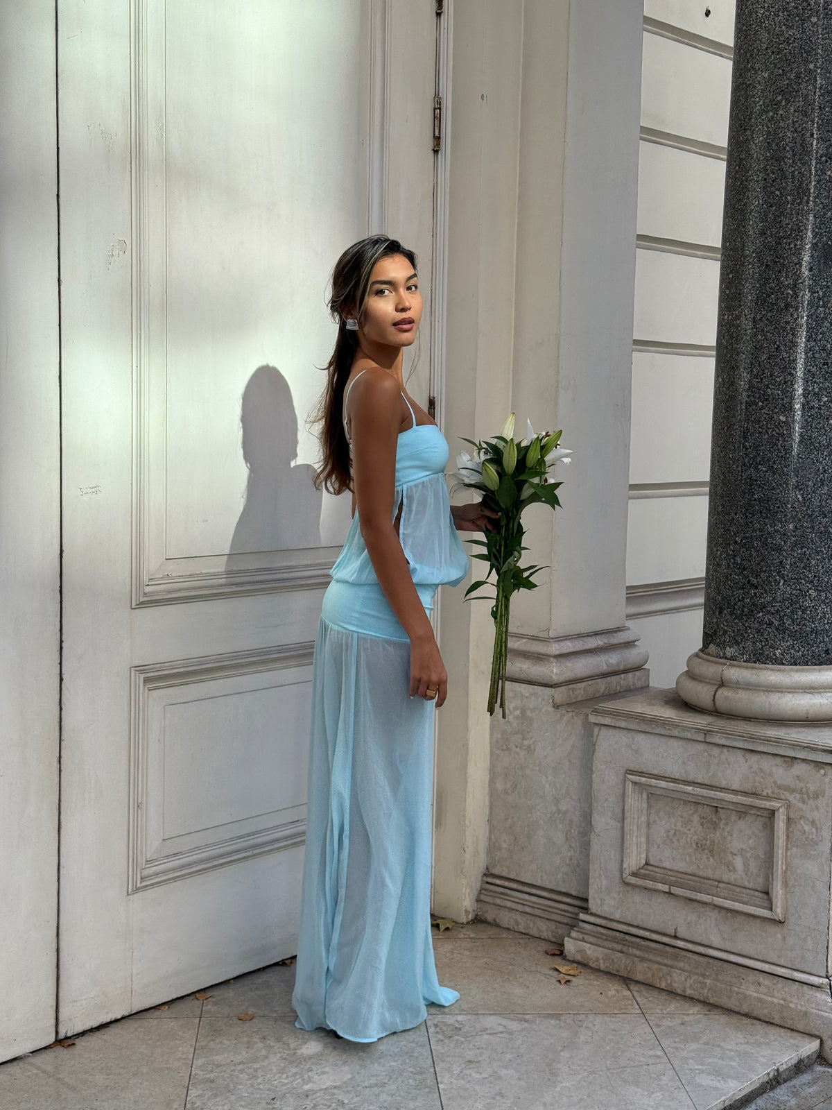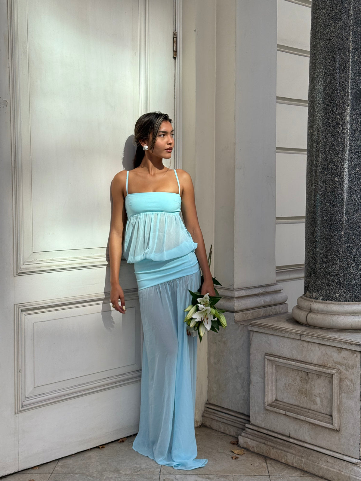 A dreamy blend of structure and softness, with a square neckline, delicate straps, and a fitted waistband flowing into a draped, asymmetric chiffon skirt. The lightweight fabric creates an elegant, fluted silhouette.