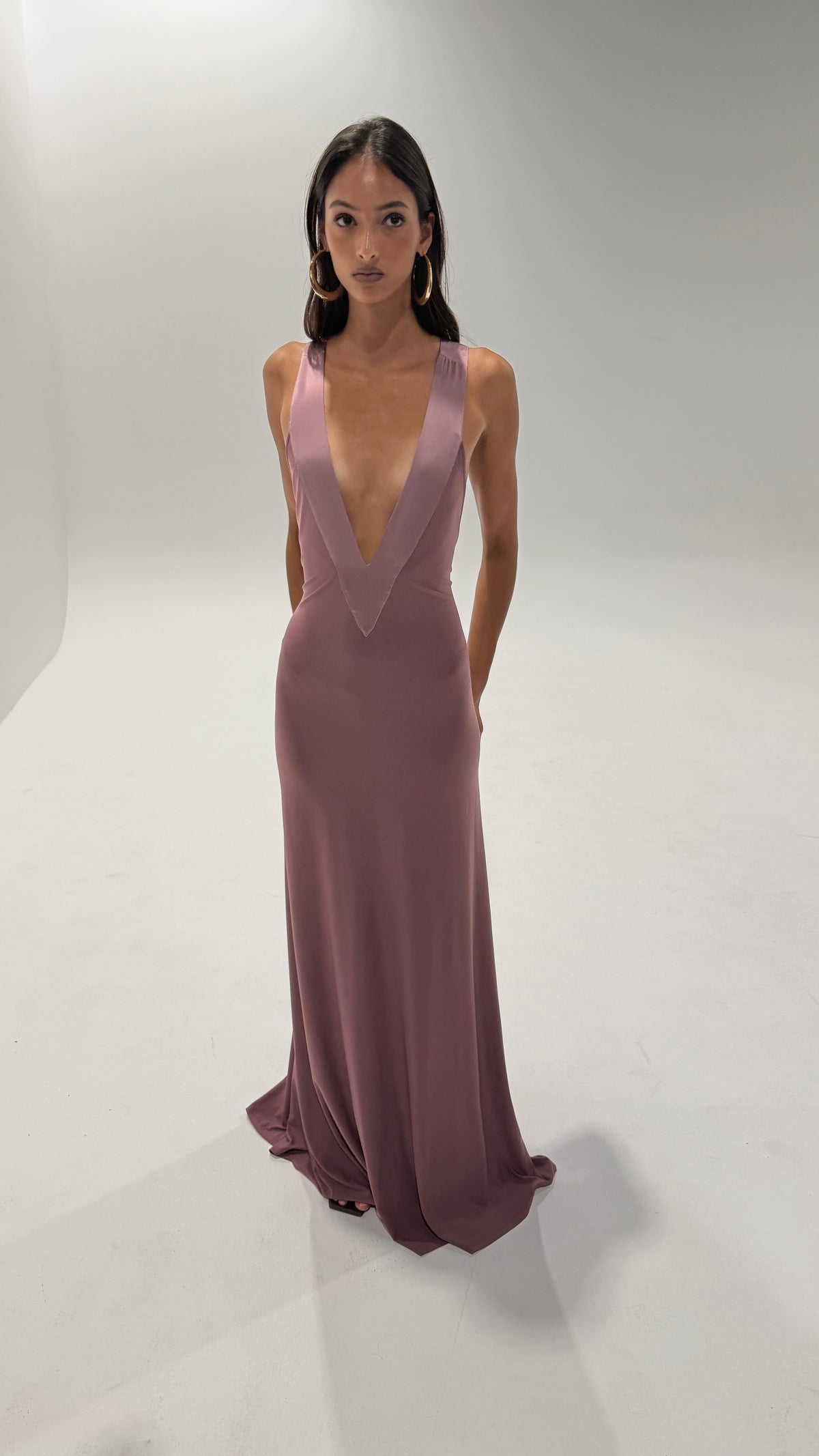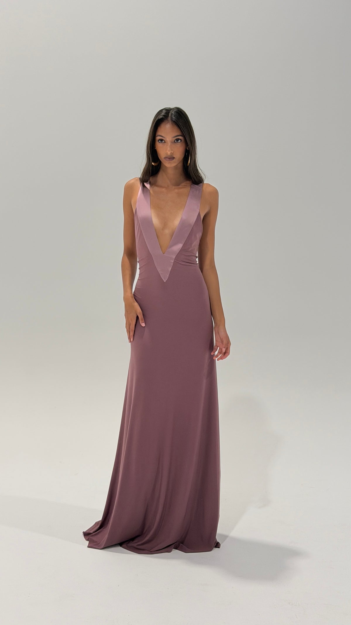 The Rosa gown features both a plunged neckline and low back accentuated with 100% silk trim detailing. The soft jersey fabric drapes, to hug the body and train in length.